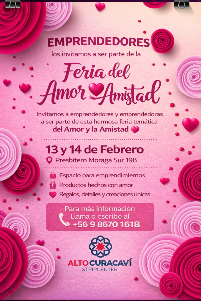 En el marco de la celebración del Mes del Amor, emprendedores y emprendedoras de la comuna y sus alrededores están invitados a ser parte de una hermosa y especial instancia: la Feria del Amor y la Amistad, un espacio pensado para destacar el talento local, la creatividad y los emprendimientos hechos con dedicación y cariño.